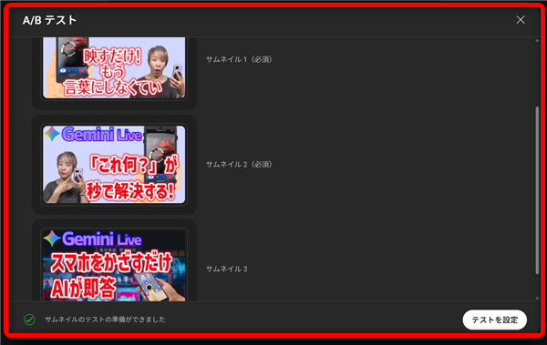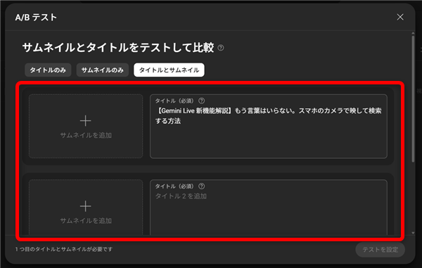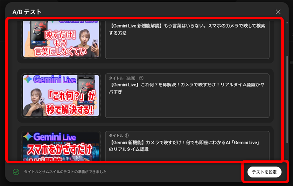 それぞれ、サムネイルとタイトルを選択して入力したら「テストを設定」をクリック