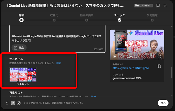 動画の詳細画面が開き、いつも通りタイトルや説明文を入力する画面になりますが、