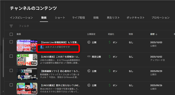 YouTubeStudioのコンテンツ画面で、このように「A/Bテストが実行中です」と