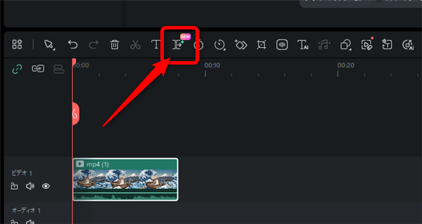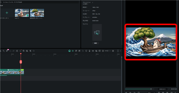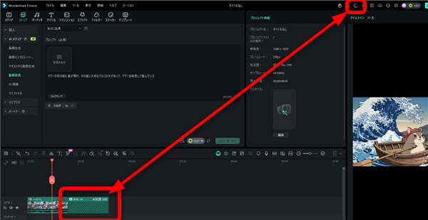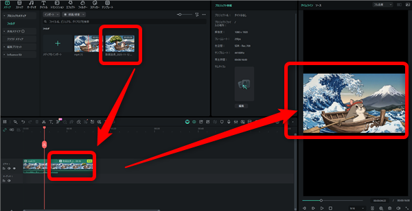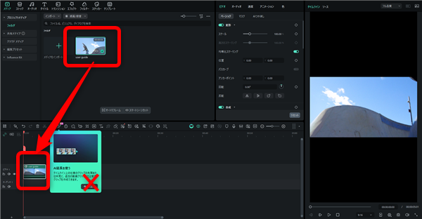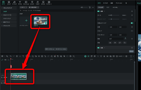 タイムラインまで動画ファイルを読み込んだらタイムラインの上の