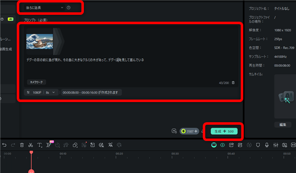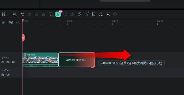 生成が完了すると、延長分のクリップが生成され、自動でタイムラインにも追加されます。