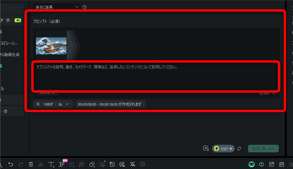 画面上部に、延長する動画をどのような動画にしたいのか?指示する文章(プロンプト)を
