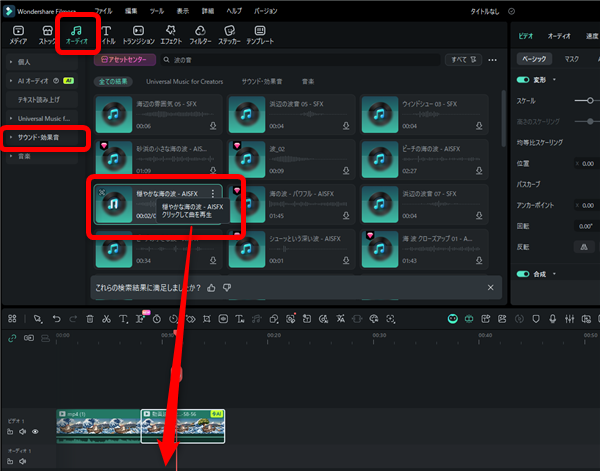 BGMや効果音は「オーディオ」の「サウンド・効果音」や「音楽」から