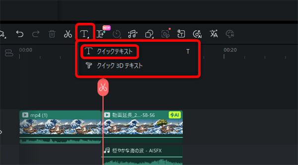 タイムラインの上の「T」のアイコンから「クイックテキスト」を選択して