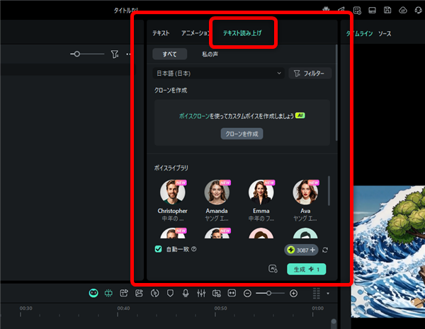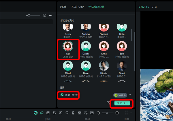 元の動画に近い音声を選んで「生成」ボタンをクリックします。