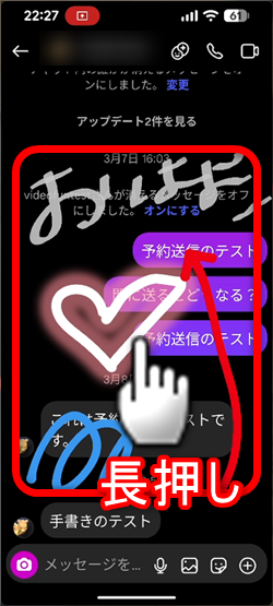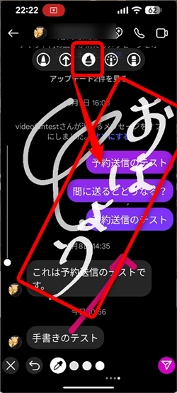 送信者側も受信者側も手書き部分を長押しすると