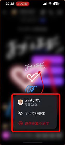 送信者側は「すべて非表示」と「送信を取り消す」ことができます。