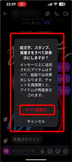 「すべて非表示」を選択すると、手書きのメッセージをすべて消すことができますが、