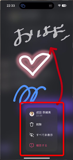 受信者側は「削除」と「すべて非表示」「報告する」とあり、