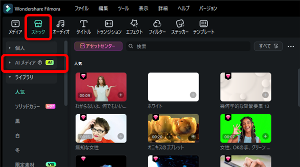 画面左上の「ストック」を開いて、左側メニューの「AIメディア」を開きます。