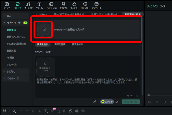 このような画面が開くので、まずは上側の「2~5秒のソース動画をアップロード」欄から