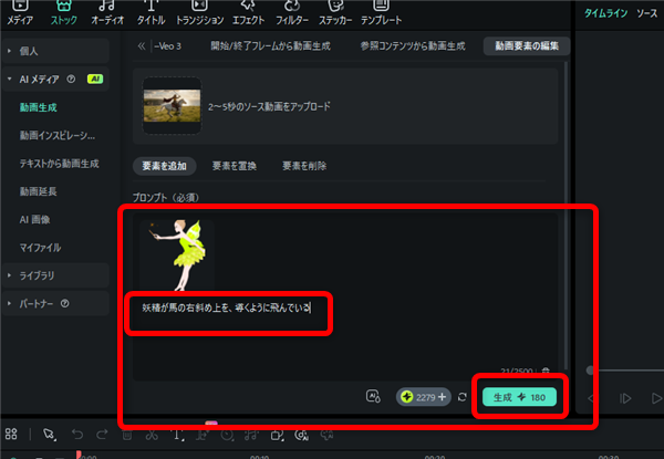 どのような動きをつけたいのか?プロンプトを記入して「生成」ボタンをクリック。