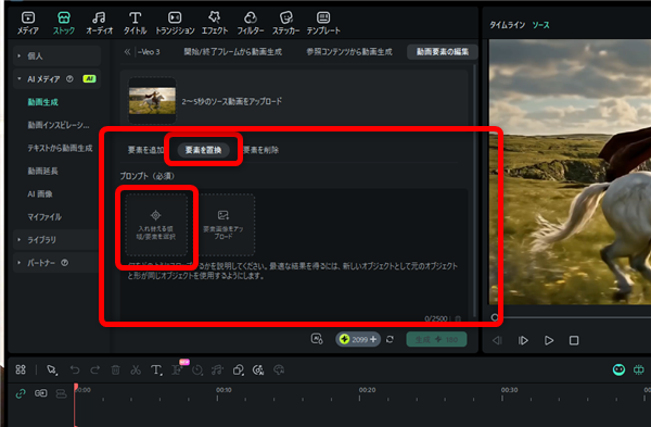 要素を置換では動画の中の人や物をアップロードした画像に変えることができます。