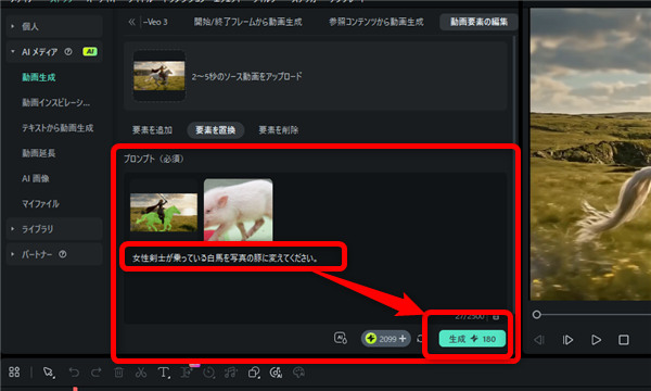 置き換えの詳細な内容のプロンプトを記入して「生成」ボタンをクリック。