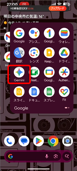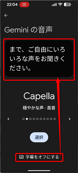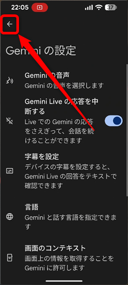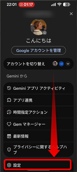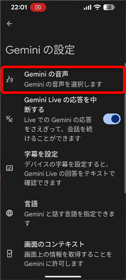 画面下側の「設定」をタップして開いたメニュー1番上の「Geminiの音声」をタップ