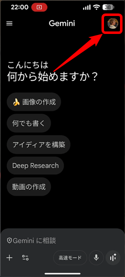 Geminiアプリを起動して画面右上のプロフィールアイコンをタップ