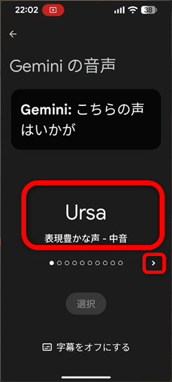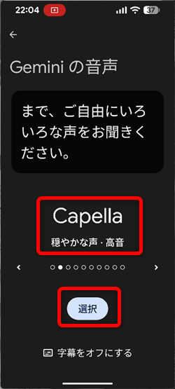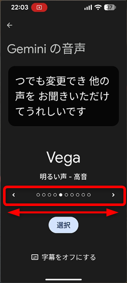 「<」「>」や画面のスワイプで音声を切り替えて、サンプルを聞いて