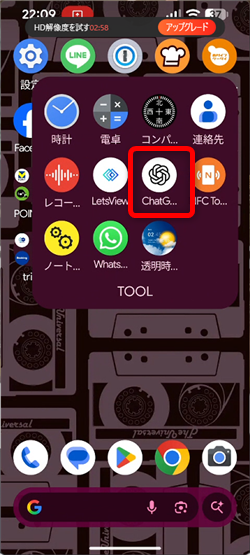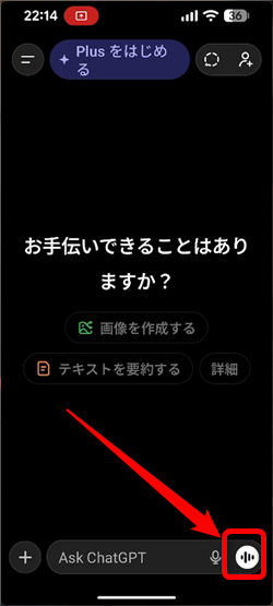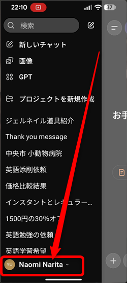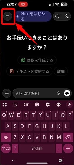 ChatGPTアプリを起動して画面左上の二本線のアイコンをタップ