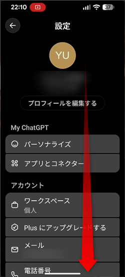 画面一番下の「自分の名前(アイコン名)」をタップして画面を下へスクロールします。