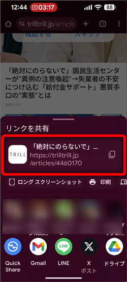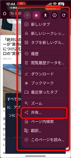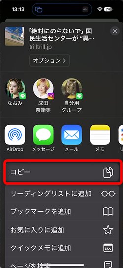 画面下側中央のこちらのアイコンをタップして「コピー」をタップ