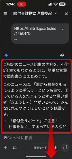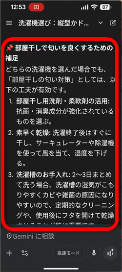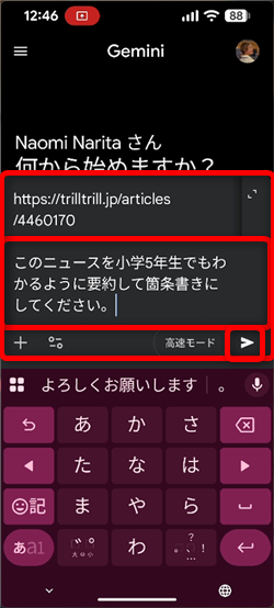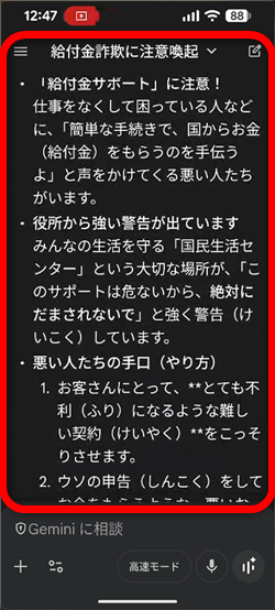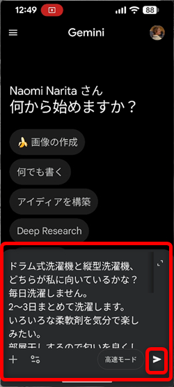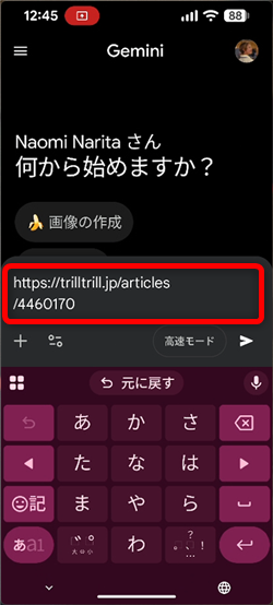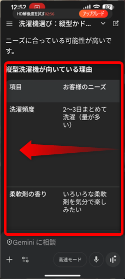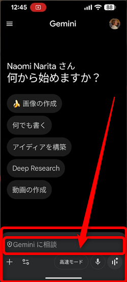 改めてGeminiを起動して「Geminiに相談」をタップして