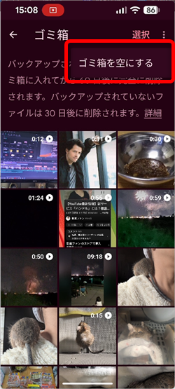 ゴミ箱に入った写真や動画ファイルは30日間は残ります。