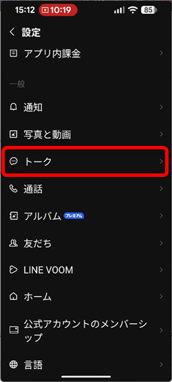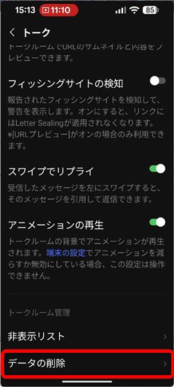 尚、すべてのトークデータの各項目の「削除」や「すべてのデータを削除」を