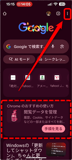 画面右上の「⋮」をタップして「閲覧履歴データを管理」をタップ