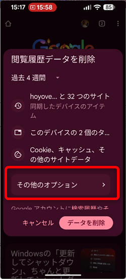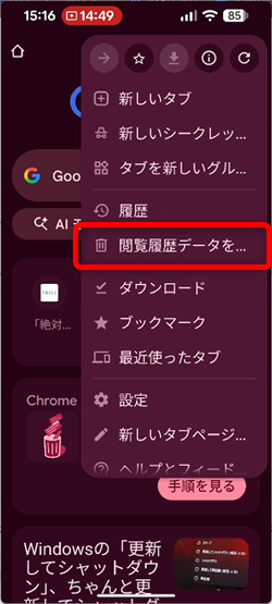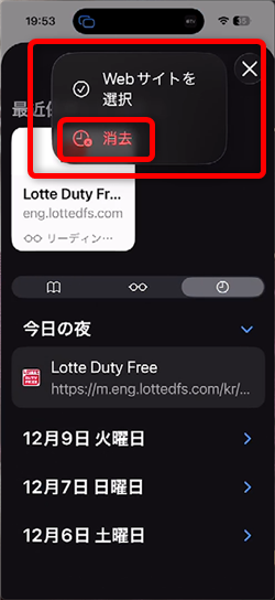 画面右上の「…」から「消去」をタップして閲覧履歴データを削除します。