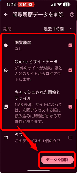ここで「閲覧履歴」「Cookieとサイトデータ」「キャッシュされた画像とファイル」に