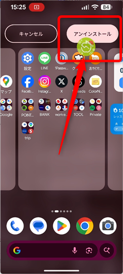 例:Pixelではいらないアプリを上部へスライドさせると「アンインストール」が表示されるので