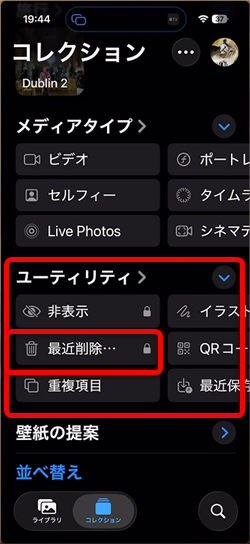 画面を下へスクロールして、ユーティリティの「最近削除した項目(ゴミ箱)」をタップ