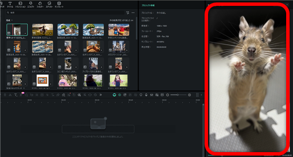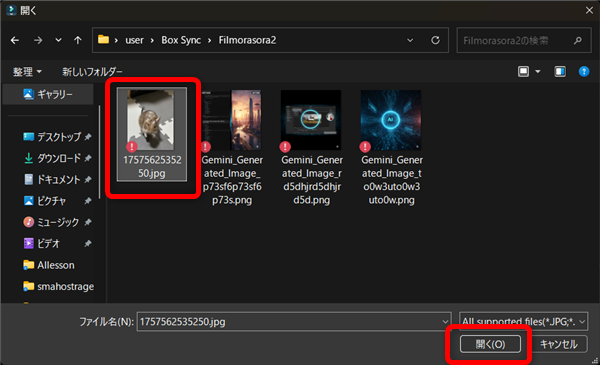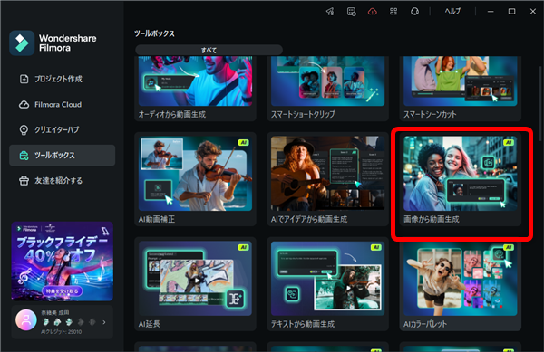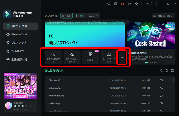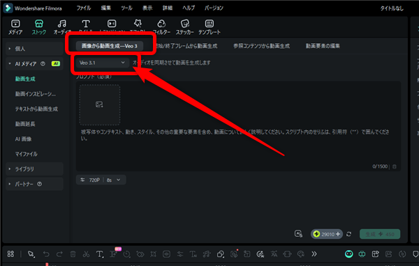 Filmoraが起動して「画像から動画生成-Veo3」などの記載のタブが開いていたら、
