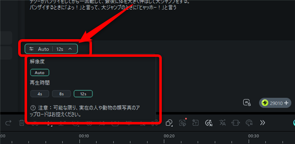 「解像度」は「Auto」だけですが「再生時間」は「4秒」「8秒」「10秒」から