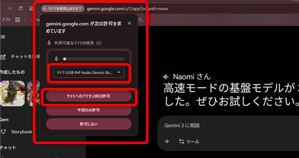 最初だけ、このようなマイクの許可に関する表示がでてきたら、