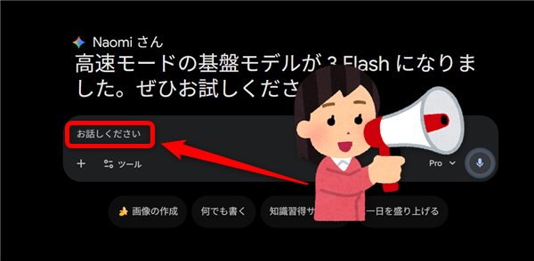 キーボードで文字入力をしなくても、マイクで音声でのプロンプト入力が
