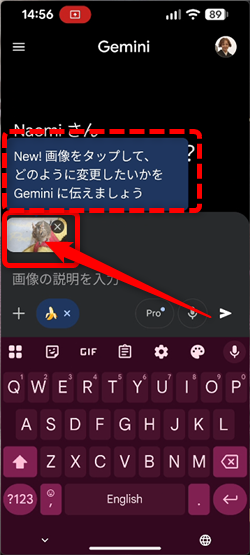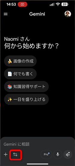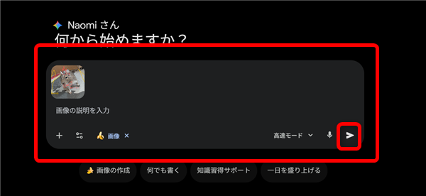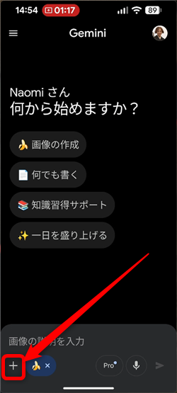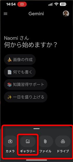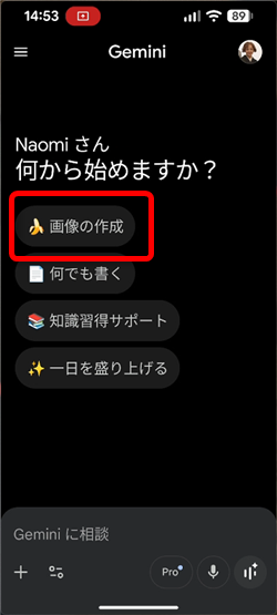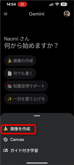 Geminiアプリを開いて「画像の作成」をタップするか、