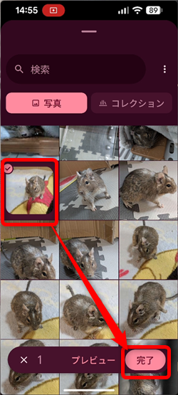 対象の写真を選択して「完了」や「✓」をタップして対象の画像をアップロードします。