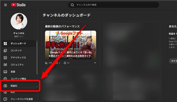 画面左側メニューの「収益化」をクリック