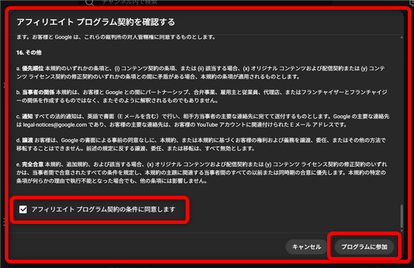 利用規約を確認して「アフィリエイトプログラム契約条件に同意します」にチェックを入れて
