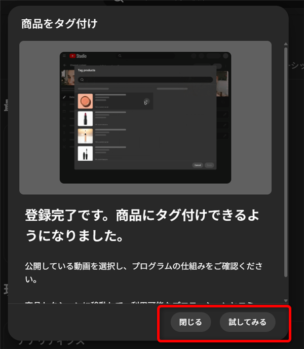 「試してみる」をタップするとコンテンツ画面になり、既存の動画に商品のタグ付けを
