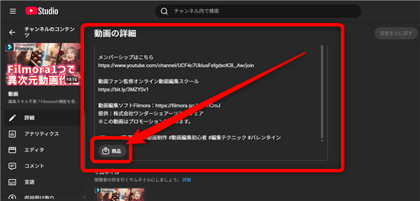 動画の説明欄の下にこのような「商品」というボタンがあるのでこちらをクリック