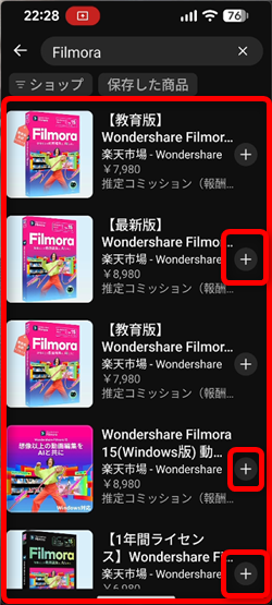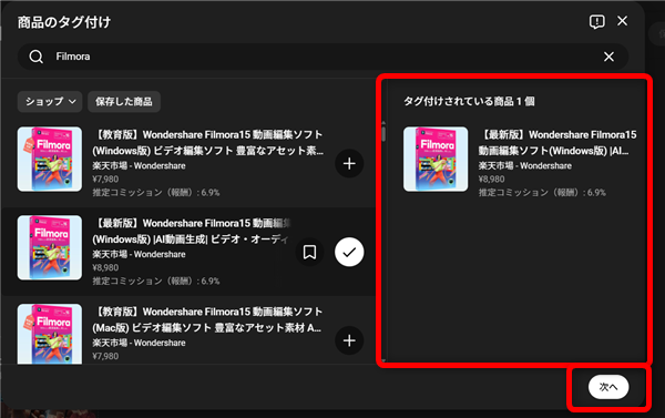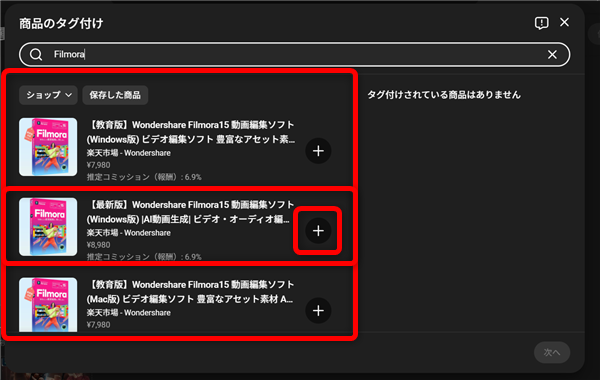 商品名で検索するとこのような一覧が開くので、タグ付けしたい商品の横の