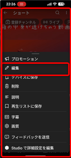 対象のショート動画の右上の「⋮」から「編集」をタップ