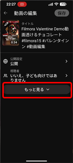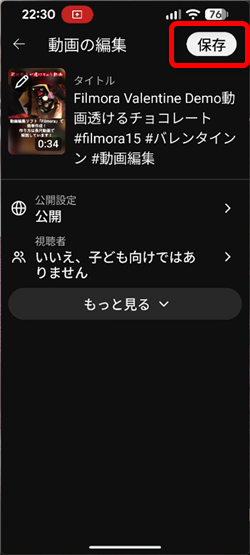 そして忘れずに画面右上の「保存」をタップ(既存の動画の設定時のみ)