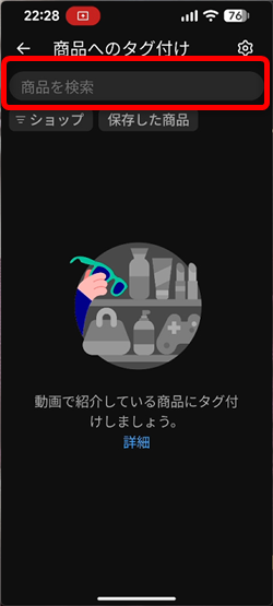 「商品へのタグ付け」をタップして「商品を検索」欄に、商品名を入れて検索するか、