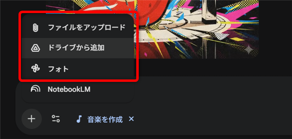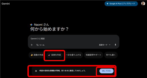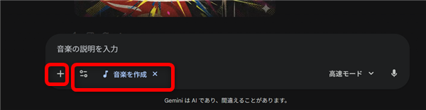 Geminiを開いたときにこのような「音楽を作成」ボタンなどが表示されていれば