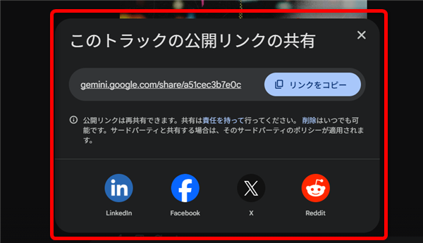 この音楽へのリンク先URLが表示され、ブログ、またfacebookやXなどで