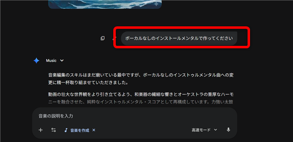 歌詞のない音楽にしてほしかったので、改めてプロンプトのみ入力してみたところ