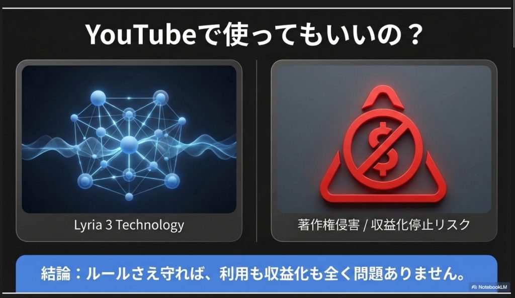 結論から言えば、YouTubeで「Lyria3」で生成した音楽を使うことはOKで、